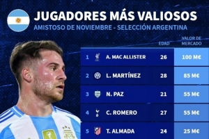 体育资讯11月15日讯 德国转会市场统计了本期阿根廷队名单的球员身价,麦卡利斯特1亿欧居首,梅西1800万欧排名第9位。